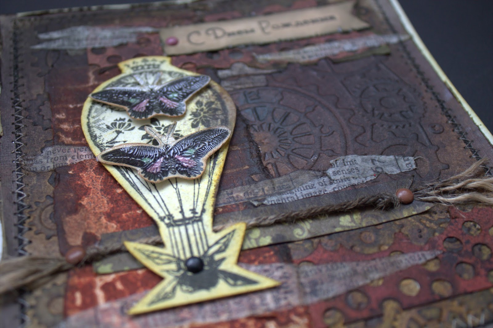 Я со своей открыткой в стиле СтимПанк. В работе использовала: тиснение на бумаге (шестеренки и кирпичная стена), отштамповку, спреи, скотч с текстом от Тима Хольтца, бичевку, братс, кракелюр на бабочках, машинную строчку.